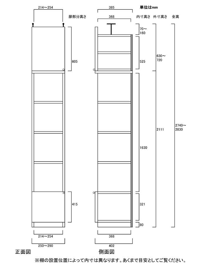 転倒対策天井つっぱり隙間収納 オーダー1cm単位 商品仕様 ■タイプ: タフ棚板(棚板厚さ2.5cm)タイプ ■棚板耐荷重: 15Kg ■外寸: 奥行40cm×高さ274.1〜283.1cm×幅25〜29cm (幅は1cm単位でオーダーできます) ■対応天井高:(2m74cm〜2m83cm) 274cm 275cm 276cm 277cm 278cm 279cm 280cm 281cm 282cm 283cm 伸縮式のつっぱり金具で高さ2m74cm〜2m83cmの天井に対応します (2m74cm 2m75cm 2m76cm 2m77cm 2m78cm 2m79cm 2m80cm 2m81cm 2m82cm 2m83cm) ■外寸(幅): 25cm 26cm 27cm 28cm 29cm ■棚板枚数 移動固定棚板:8 ■構成:本体…奥行40cm×高さ211.1cm×幅25〜29cm 突っ張り棚…奥行40cm×高さ56cm×幅25〜29cm 本体用扉…高さ41.5cm×幅25〜29cm 突っ張り棚用扉…高さ60.5cm×幅25〜29cm オーダー 天井つっぱり隙間収納_ 商品詳細 本体 + 突っ張り棚 + 本体用扉 + 突っ張り棚用扉のセットです。
