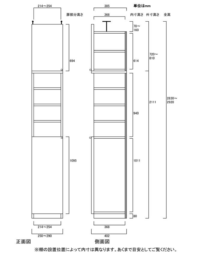 防振対策扉付リビングすきま収納 日本製 商品仕様 ■タイプ: 標準棚板(棚板厚さ1.7cm)タイプ ■棚板耐荷重: 10Kg ■外寸: 奥行40cm×高さ283.1〜292.1cm×幅25〜29cm (幅は1cm単位でオーダーできます) ■対応天井高:(2m83cm〜2m92cm) 283cm 284cm 285cm 286cm 287cm 288cm 289cm 290cm 291cm 292cm 伸縮式のつっぱり金具で高さ2m83cm〜2m92cmの天井に対応します (2m83cm 2m84cm 2m85cm 2m86cm 2m87cm 2m88cm 2m89cm 2m90cm 2m91cm 2m92cm) ■外寸(幅): 25cm 26cm 27cm 28cm 29cm ■棚板枚数 移動棚板:4 移動固定棚板:4 ■構成:本体…奥行40cm×高さ211.1cm×幅25〜29cm 突っ張り棚…奥行40cm×高さ65cm×幅25〜29cm 本体用扉…高さ109.5cm×幅25〜29cm 突っ張り棚用扉…高さ69.4cm×幅25〜29cm オーダー 扉付リビングすきま収納_ 商品詳細 本体 + 突っ張り棚 + 本体用扉 + 突っ張り棚用扉のセットです。