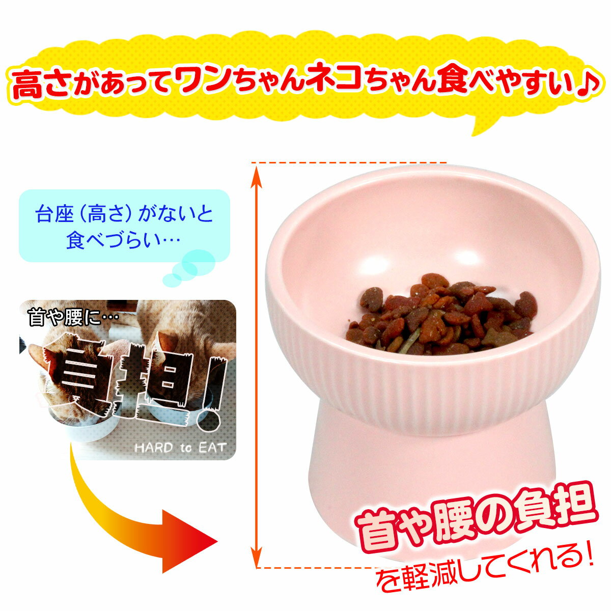 高さがあるフードボウルなのでネコちゃん、ワンちゃんがエサを食べやすいようになっています。