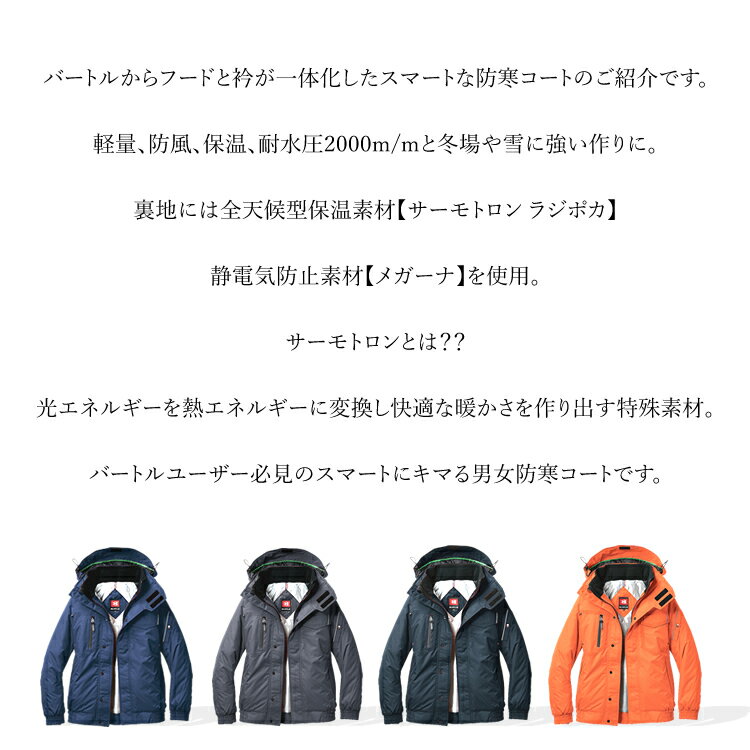商品説明 バートルからフードと衿が一体化したスマートな防寒コートのご紹介です。