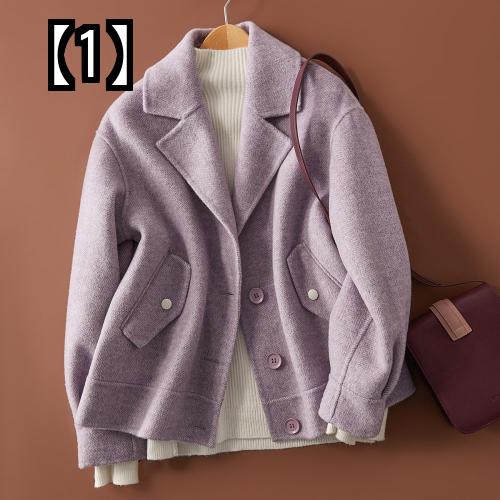 コート レディース 春 アウター ウール 暖かい ショート丈 ゆったり トップス カジュアル おしゃれ 紫