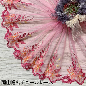 両山幅広チュールレース 幅約24cm 1m単位 赤 オレンジ 黄色 幅広レース 光沢 チュールレース 生地 レース 花柄 花模様 素材 装飾 材料 衣装 ドレス ドール服 レースマスク 手作りマスク マスクカバー インテリア雑貨 手芸 ハンドメイド 洋服 おしゃれ かわいい カット売り
