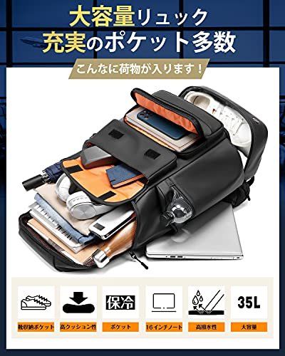 商品情報商品の説明主な仕様 【35リットル大容量設計】スクエア型+幅広マチで収納力抜群、最大16インチのノートパソコン、A4サイズの書類、靴や一泊二日の着替えなどを、これ一つにまとめて収納可能です! 【便利なポケット】リュックは20個ポケットが付き、物を分けてスッキリ収納できます;特に靴収納ポケット、保冷ポケット、背面防犯ポケットを設け、出張や旅行、ジムにおすすめのモデルです 【体にやさしいバックパック】チェストベルトとヒップベルトの二重設計で、より安定してリュックを身体に固定することが出来て、より一層身体に負担をかけるのを軽減し、長時間背負っても疲れにくく、快適な背負い心地を確保します 【安心安全設計の、守れるPCスペース】背中側に最大16インチのノートパソコンが収納可能。