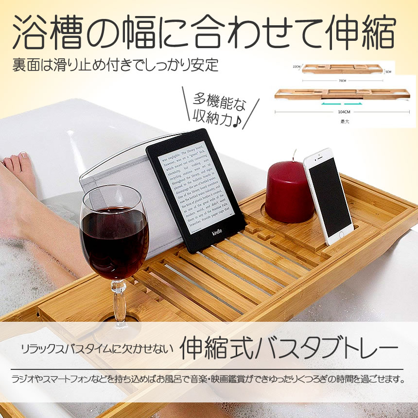 ■ 【サイズ】 (70-104)*22*5CM ■ 【本体重量】 1.5kg ■ 【素材・材質】:天然竹製 ■ ラジオやスマートフォンなどを持ち込めば お風呂で音楽・映画鑑賞ができ ゆったりくつろぎの時間を過ごせます。