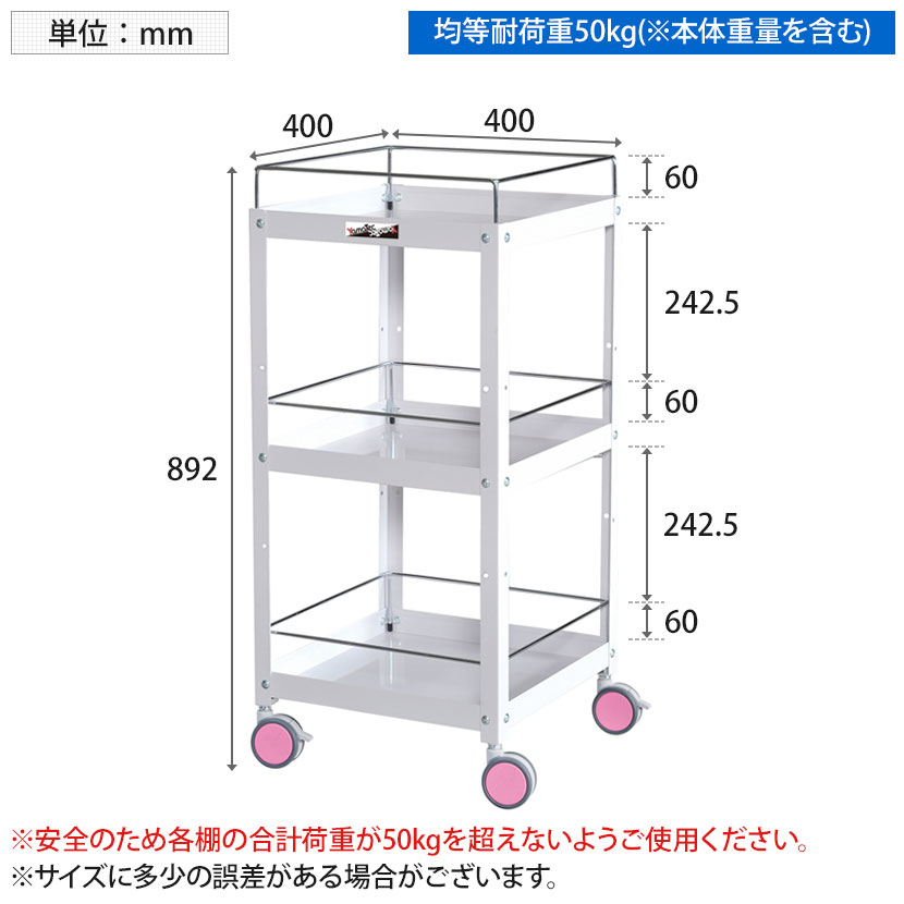 商品について サイズ幅400×奥行400×高さ892mm 重量10.3kg 均等耐荷重96kg(※本体重量を含む) キャスタータイプ直径75mmウレタン巻双輪キャスター(4輪自在(ストッパー付き2個)) 段数3段 生産国日本 組立時間(目安)1人 / 40分 梱包数3箱 梱包サイズ梱包1 / 幅950×奥行95×高さ105mm梱包2 / 幅430×奥行430×高さ150mm梱包3 / 幅390×奥行390×高さ100mm 梱包重量梱包1 / 3.9kg梱包2 / 5.2kg梱包3 / 1.2kg 備考コボレ止め付き粉体塗装(パールピンク)グリーン購入法適合商品 配送について 配送費用について法人様配送費無料個人様・北海道、沖縄、離島は別途送料。