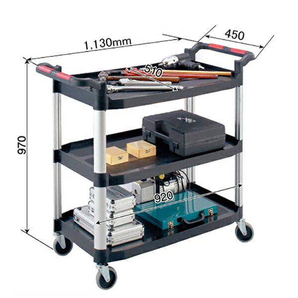 ●材質:プラスチック・アルミ ●耐荷重:1段180kg(合計540kg) ●サイズ:巾1.130×奥行510×高さ970mm ●車輪:自在輪φ100mm・4ヶ(内2ヶストッパー付) ●自重:15.4kg ※工具等は付いていません。