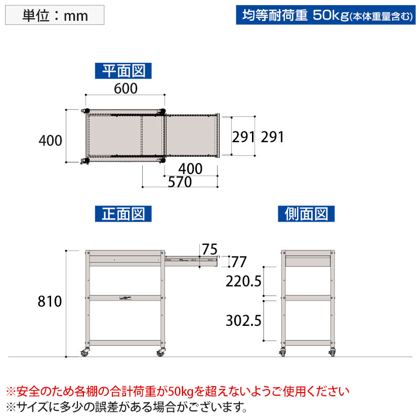 商品サイズ 商品について サイズ幅600×奥行400×高さ810mm 重量15.1kg 全体均等耐荷重96kg(自重を含む) キャスタータイプ直径50mmゴムキャスター(自在ストッパー付き2個、自在2個) 組立時間1人 / 40分※組立時間はあくまで目安となります。