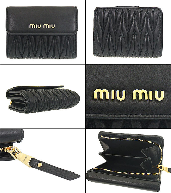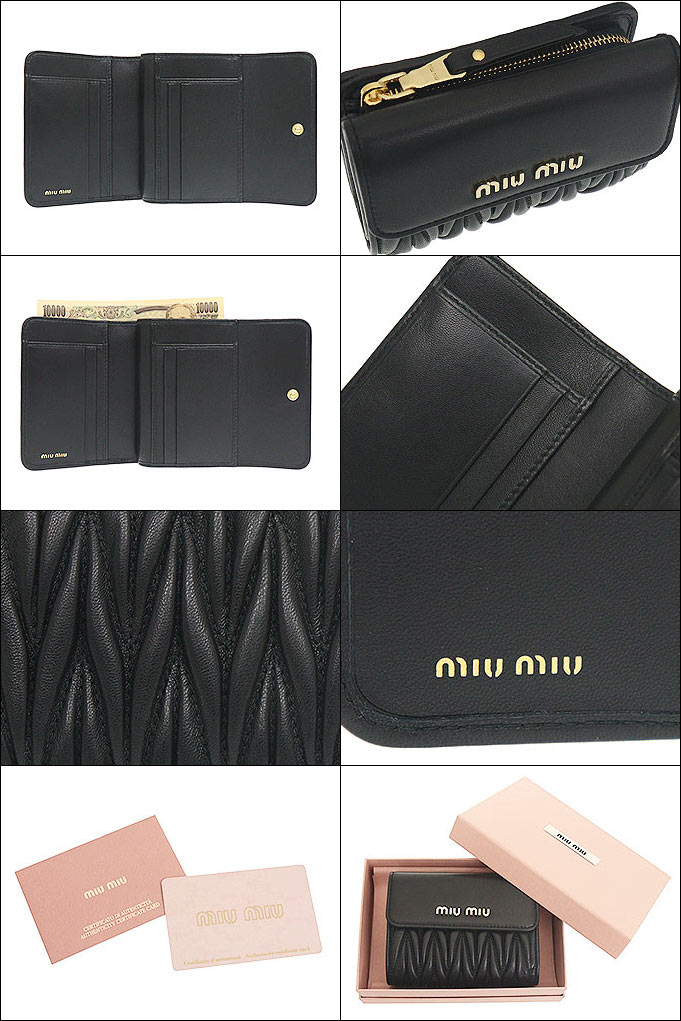 ●【ミュウミュウ miumiu】 マテラッセ レザー メタル ロゴ バイフォールド コンパクト ウォレット 名称MATELASSE PORTAF.PICCOLO LAMPO 種類 小物/財布/二つ折り財布 サイズ 横幅:12cm 高さ:9cm マチ:3cm 重さ:130g 仕様間口:スナップボタン開閉 内部:札入れ×1 カード入れ×6 ポケット×2 背面:小銭入れ 素材レザー カラー ネロ F0002 NERO 【金具の色】ゴールド 型番 5ML002 N88 付属品 ギャランティーカード 純正BOX ※付属の箱について 海外からの輸送中にキズ、はがれ等の損傷がある場合がございますので予めご了承下さい。