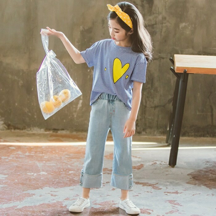 着こなし・コーディネートシリーズ■ハートプリントT×デニムパンツカジュアルコーデ2点セット 100cm/110cm/120cm/130cm/140cm/150cm■半袖Tシャツ/夏服/Tシャツ 子供/上下セット/子供服/女の子/女児/デザインTシャツ/Tシャツ キッズ/Tシャツ 半袖/ハーフパンツ